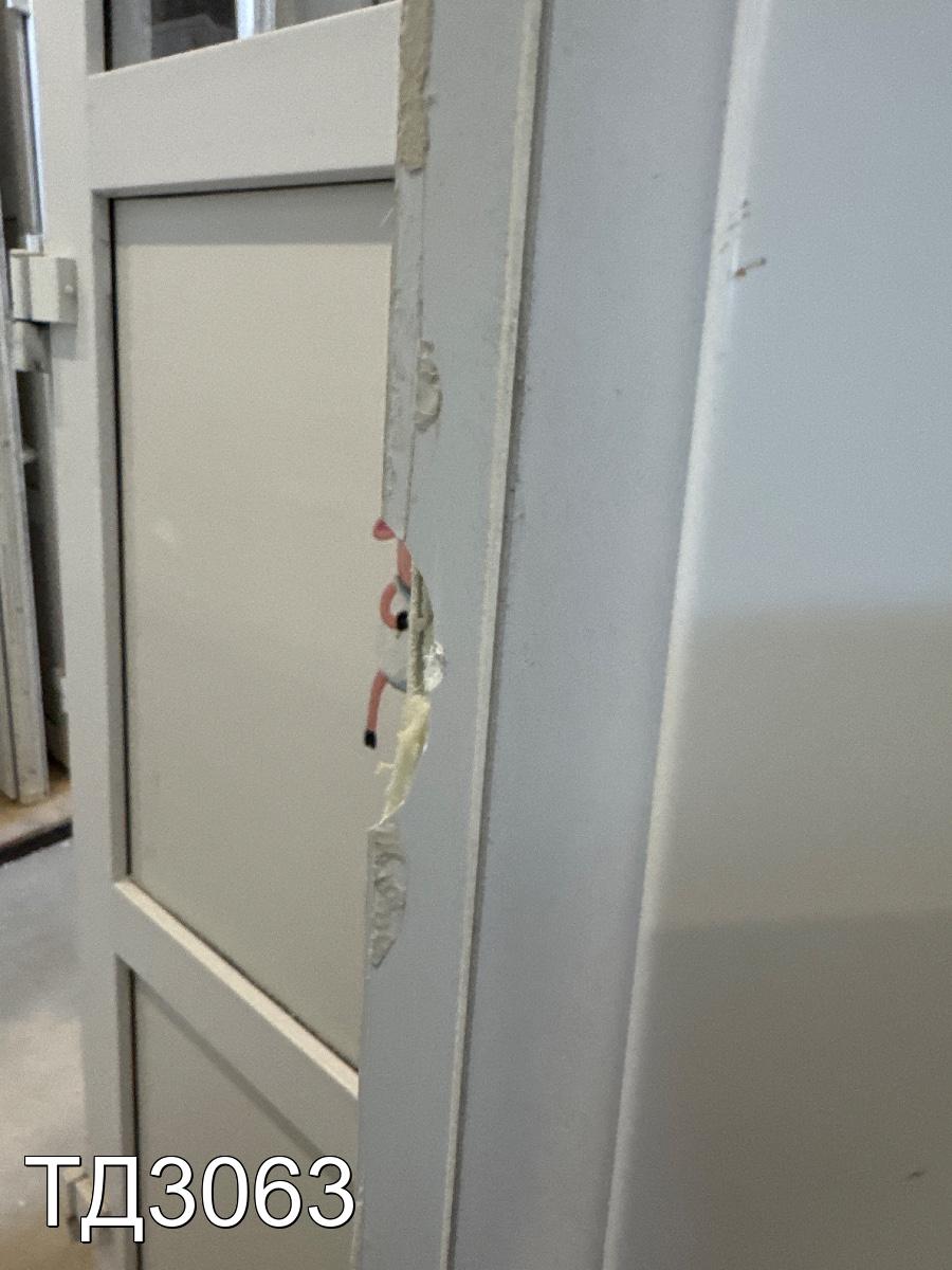 Дверь разделена на три части: сверху в одно стекло, снизу, сэндвич-панели.