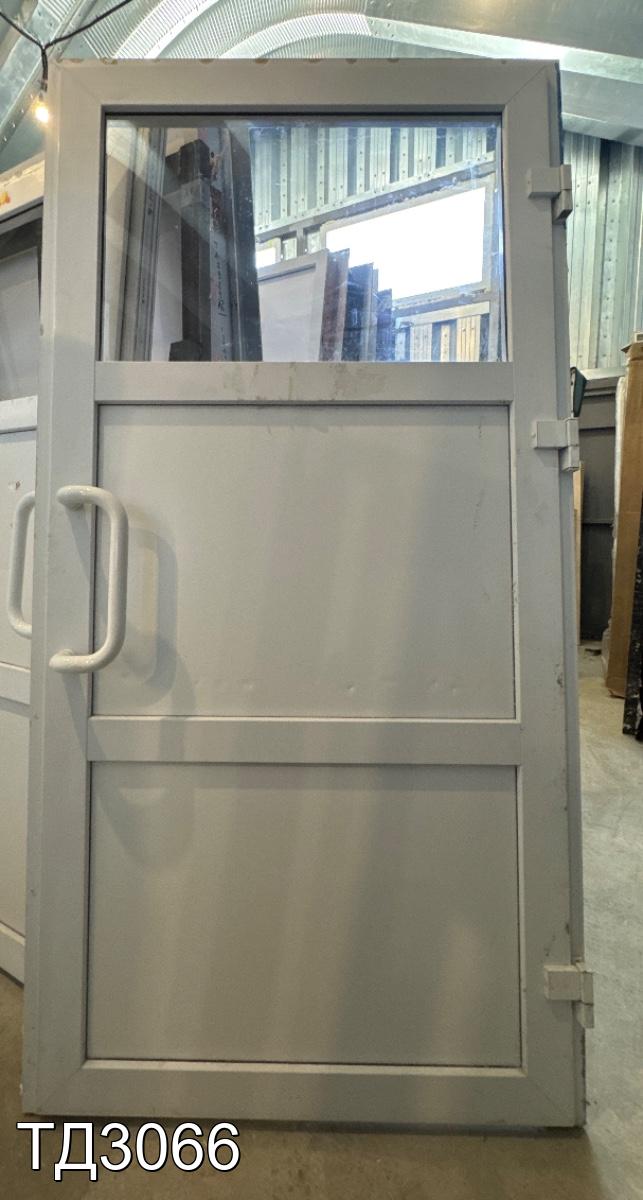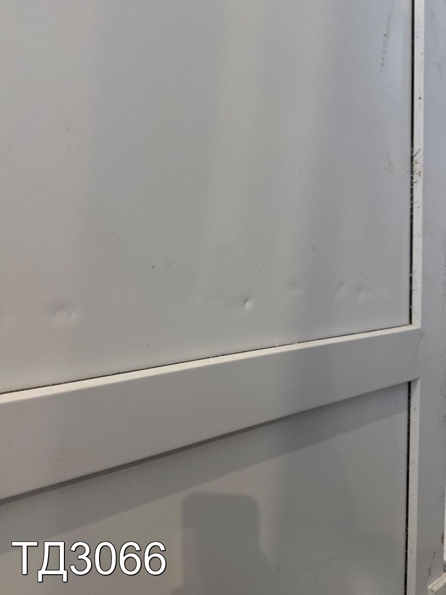 Дверь разделена на три части: сверху в одно стекло, снизу, сэндвич-панели.