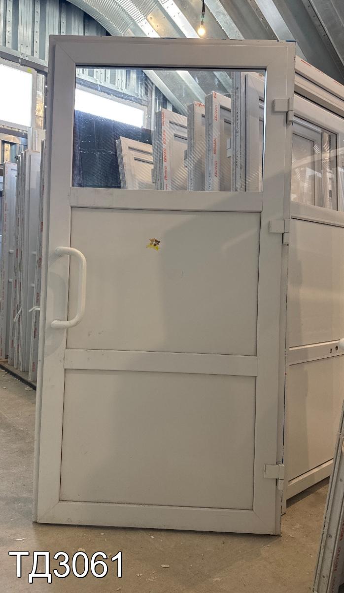 Дверь разделена на три части: сверху в одно стекло, снизу, сэндвич-панели.