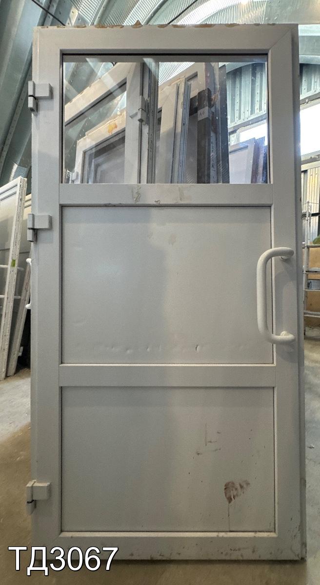 Дверь разделена на три части: сверху в одно стекло, снизу, сэндвич-панели.