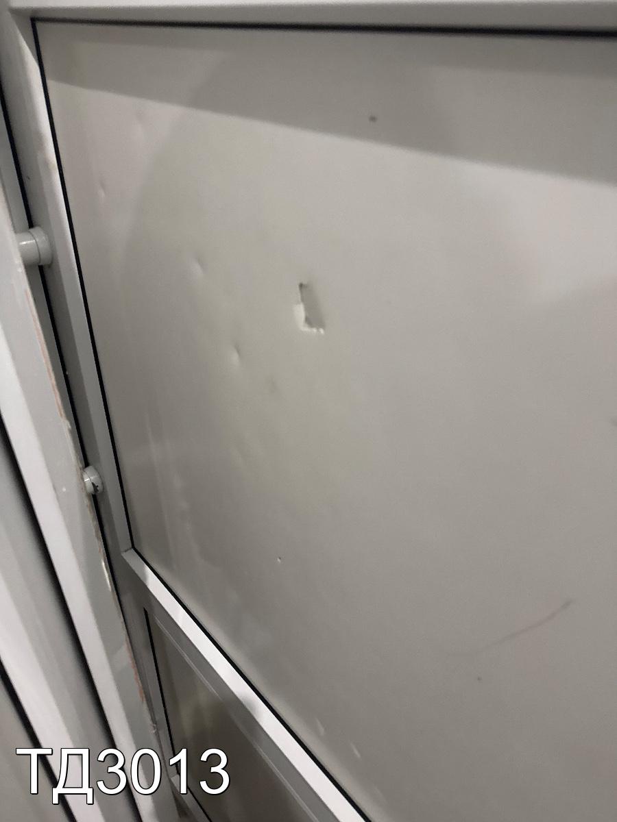 Дверь разделена на три части: сверху в одно стекло, снизу, сэндвич-панели.
